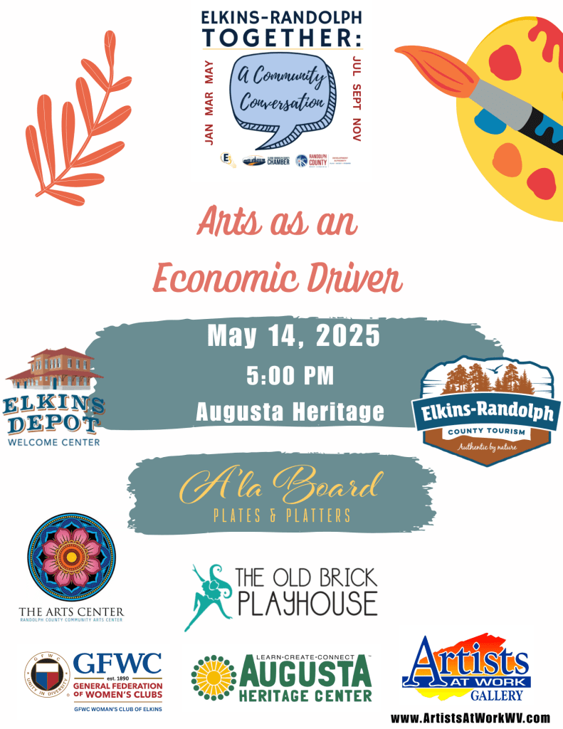 We’re so excited! Join us for a powerful Arts as an Economic Driver – Community Conversation happening on Wednesday, May 14 at 5:00 PM at the Augusta Heritage Center in downtown Elkins!